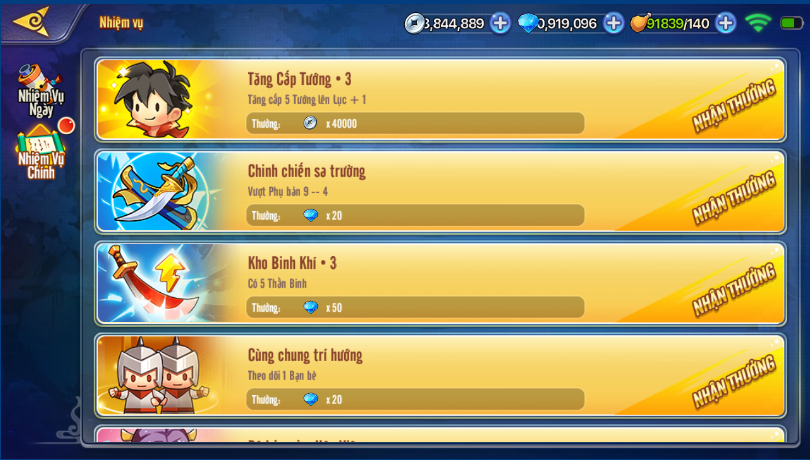 Hệ thống nhiệm vụ chính tuyến bao gồm các nhiệm vụ tăng cấp nhân vật, vượt ải, sở hữu tướng, tăng cấp, tăng sao tướng, cường hóa trang bị, ... đạt cấp nhận thưởng, click nhận thưởng để nhận các nhiệm vụ đã hoàn thành