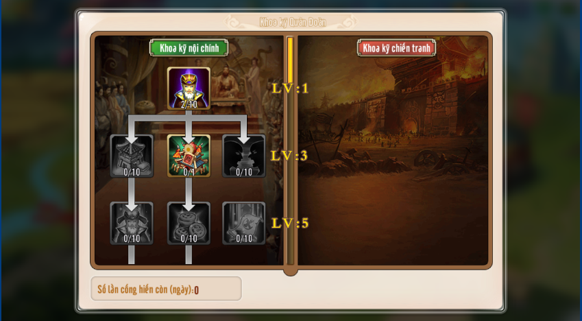 Các khoa kỹ có yêu cầu level Quân Đoàn và level khoa kỹ liên quan tương ứng để mở. Khi tăng cấp sẽ nhận được hiệu quả buff tương ứng