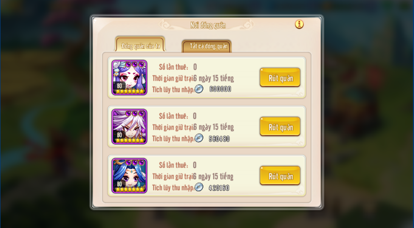 Thành viên Quân Đoàn có thể bỏ bạc để thuê tướng đóng quân, doanh địa sẽ dựa theo thực lực tướng để định giá