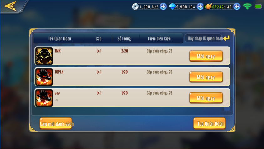 Tại giao diện mở ra, Chúa Công có thể lựa chọn danh sách các Quân Đoàn hiện có để gia nhập hoặc tạo lập Quân Đoàn của riêng mình (tiêu tốn 300 KC)