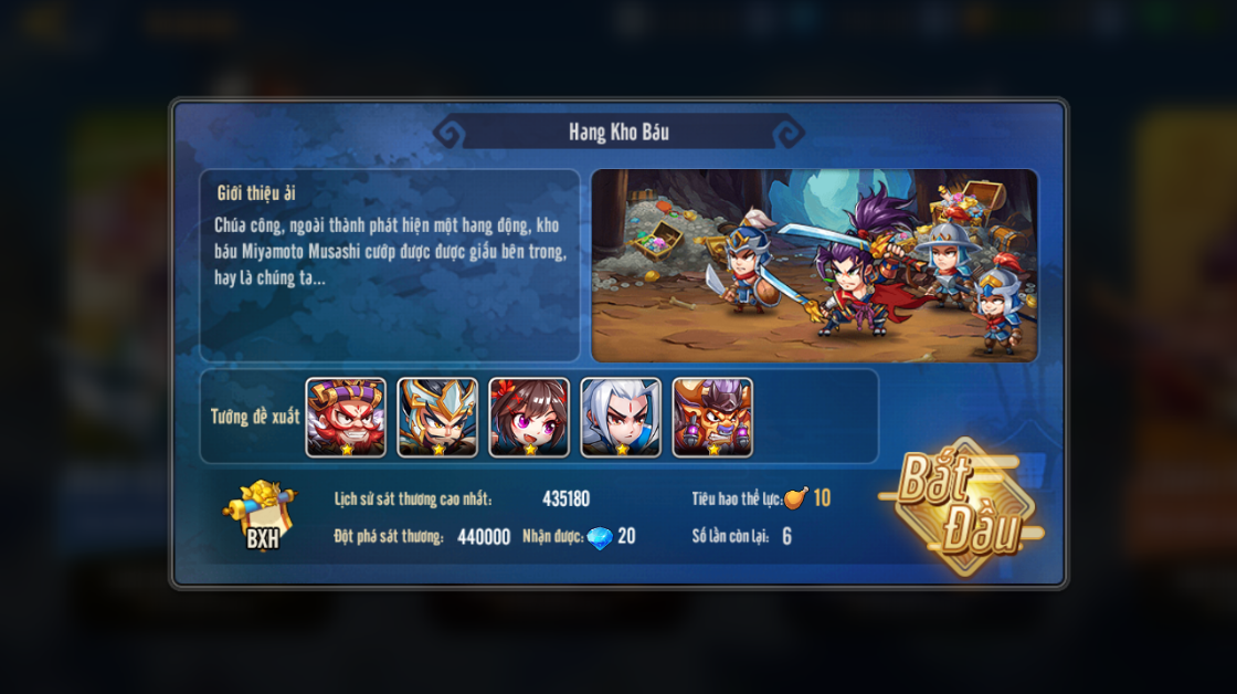 08/12Hang Kho Báu là hoạt động giúp người chơi kiếm bạc, truy cập biểu tượng Khu Tập Luyện trong giao diện thành chủ và chọn Hang Kho Báu để tham gia