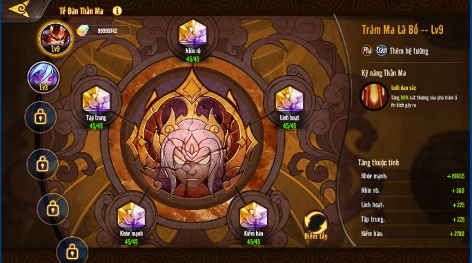 Ghép đủ mảnh sẽ hình thành 1 Tế Đàn Thần Ma hoàn chỉnh, tướng thuộc hệ tương ứng với Thần Ma sẽ nhận được che chở và buff thuộc tính, kĩ năng, giúp tăng lực chiến và sức mạnh chiến đấu