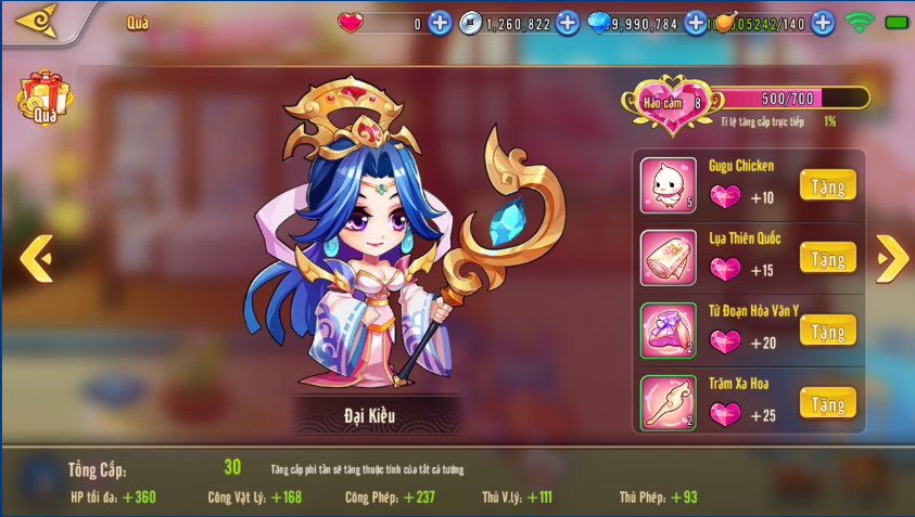 Tặng quà sẽ tiêu hao các vật phẩm như Gugu chicken, Lụa Thiên Quốc, Từ Đoạn Hỏa Vân Y, Trâm Xa Hoa, Như Ý Thần Kỳ, Khóa Đồng Tâm đồng thời nâng điểm hảo cảm, mỗi khi độ hảo cảm tăng lên 1 cấp, Chúa Công sẽ nhận được thêm các hiệu ứng buff HP, công thủ vật lý hoặc phép